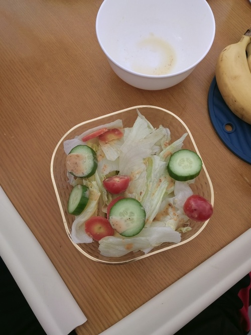 食材:生菜球,水果黄瓜、水果萝卜、小番茄、沙拉 准备: 生菜球——一个,清洗干净,撕开 水果黄瓜——切圆片 水果萝卜——切圆片 小番茄——对半切开 装盘: 将所有食材放入盘中,撒上沙拉即可