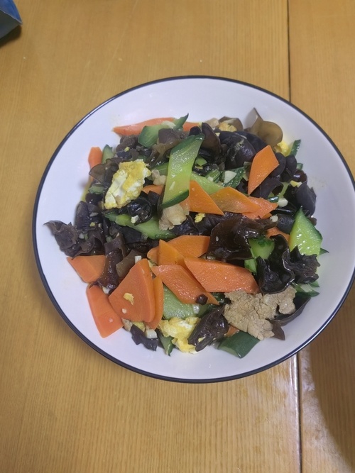 食材:猪肉、木耳、黄花菜、胡萝卜、黄瓜、鸡蛋、淀粉、葱、大蒜、生姜 调料:油、盐、胡椒粉、生抽、葱姜水、白糖、鸡精、耗油、料酒 准备: 猪肉——一小块猪瘦肉,切成薄片,放入碗中,加入少许盐、胡椒粉、生抽、葱姜水、一个蛋清,用手抓拌均匀,抓至发粘,再放入干淀粉(最好选用玉米淀粉),继续抓拌均匀,最后淋入植物油 木耳——凉水泡发,泡发后剪成小块 黄花菜——凉水泡发,泡发后挤干水分,切成小段 黄瓜——半根,切成棱形 胡萝卜——半根,切成棱形 鸡蛋——两个,打入碗中,加入少许胡椒粉,用快速搅拌均匀 生姜——切成小粒 大蒜——拍碎剁成末 料汁——碗中放入少许盐、白糖、鸡精、生抽、耗油,加入少许清水,干淀粉,搅拌均匀备用 下锅: 1、木耳、黄花菜焯水——锅中加水,水开后先倒入黄花菜,5秒后,倒入木耳,十秒后捞出控水备用 2、炒蛋——重新起锅,下入油,油热后放入蛋液,炒熟炒散出锅备用 3、重新起锅,加入油,油热后放入肉片,炒的时间不早太久,微微变色后放入大蒜、葱、姜,炒出香味,淋入少许料酒,去腥,放入木耳、黄花菜,翻炒均匀,再放入黄瓜、胡萝卜,继续翻炒均匀,倒入调好的料汁,翻炒两下,放入鸡蛋,继续翻炒,出锅前在淋入少许油,即可